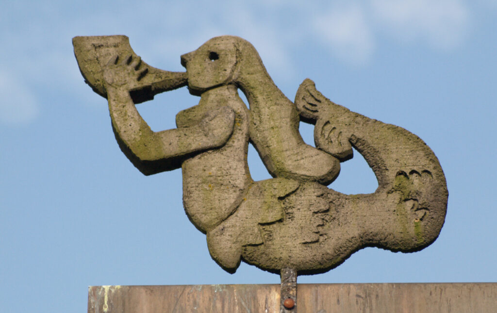 Tweehonderd kilometer van zee, in het dal van de Aalsbeek, kunt u zomaar een zeemeermin ontmoeten. Triomfantelijk blaast zij op haar hoorn – een schelp ongetwijfeld. Het zou zomaar een sprookje of zinsbegoocheling kunnen zijn. Glazenier Joep Nicolas en zijn vrouw, de beeldhouwster Suzanne Nys, bezochten vaak Oostende en per definitie het James Ensor Huis daar, dat zij zeer bewonderden.