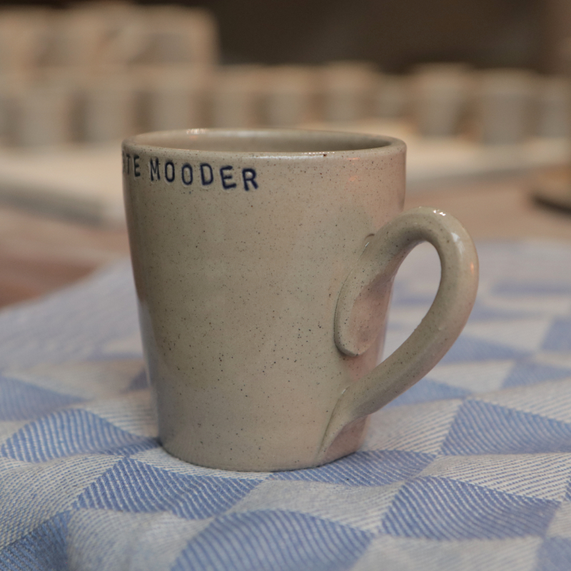 Koffiekopje van keramiek met de Limburgse tekst ‘Allerleefste mooder’.