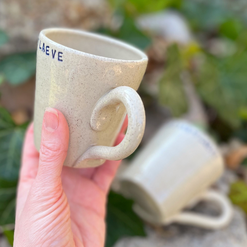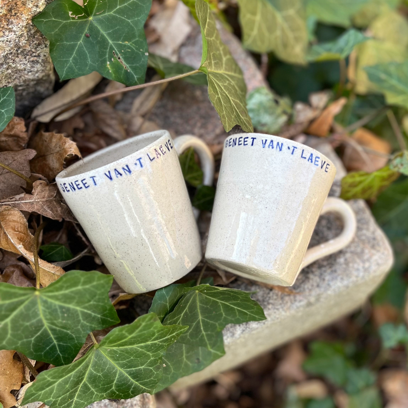 Keramiek koffiekopje met de tekst ‘Geneet van ´t Laeve’.