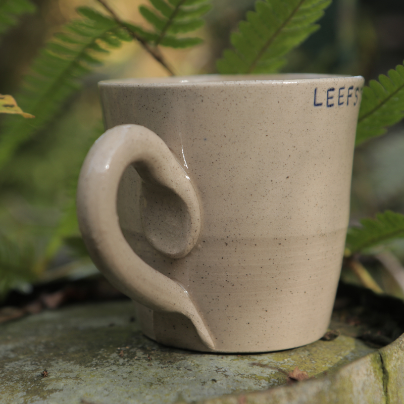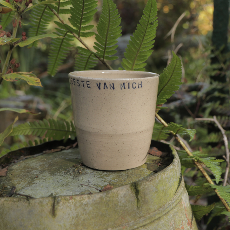 Koffiekopje van keramiek met de Limburgse tekst ‘Leefste van mich’.