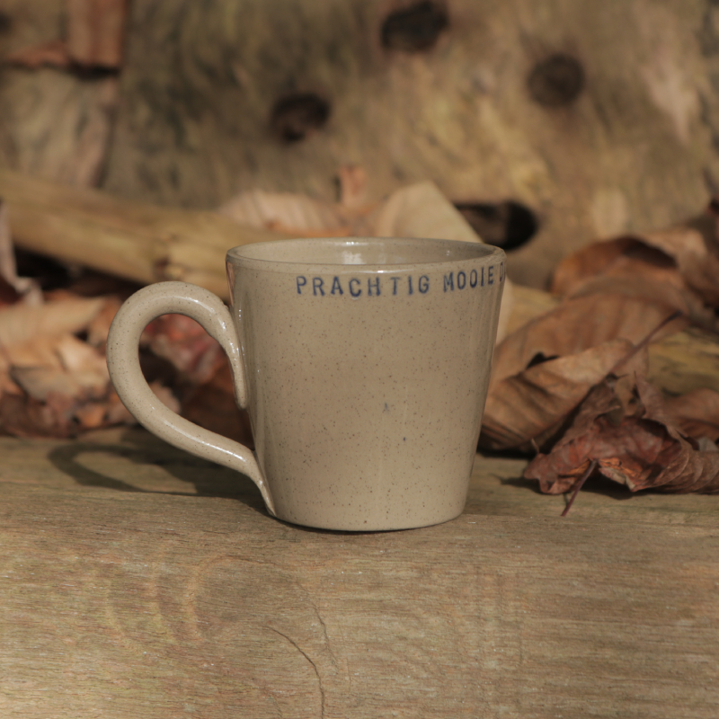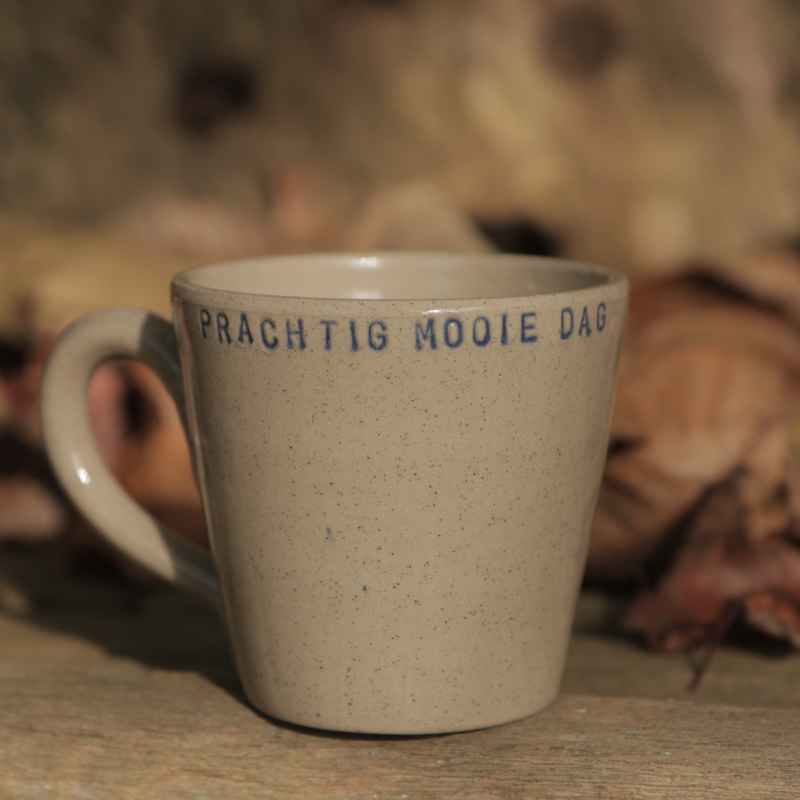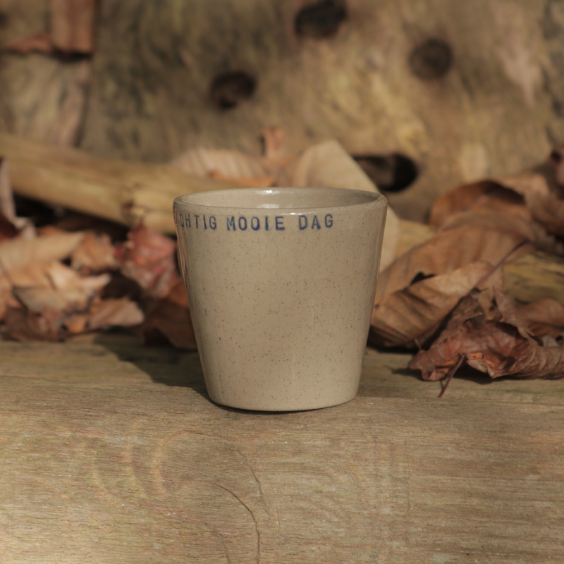 Keramiek kopje met de tekst ‘Prachtig mooie dag’.