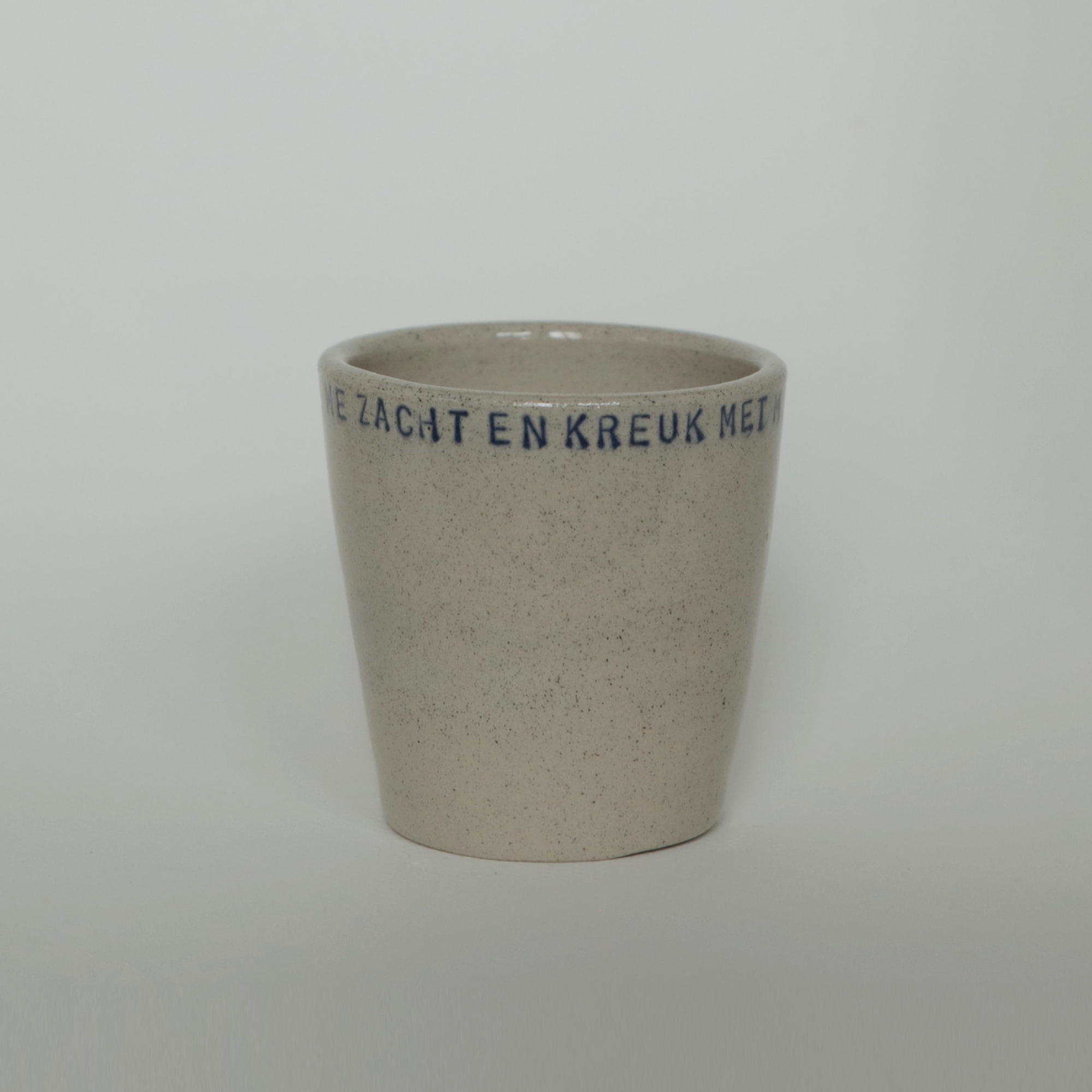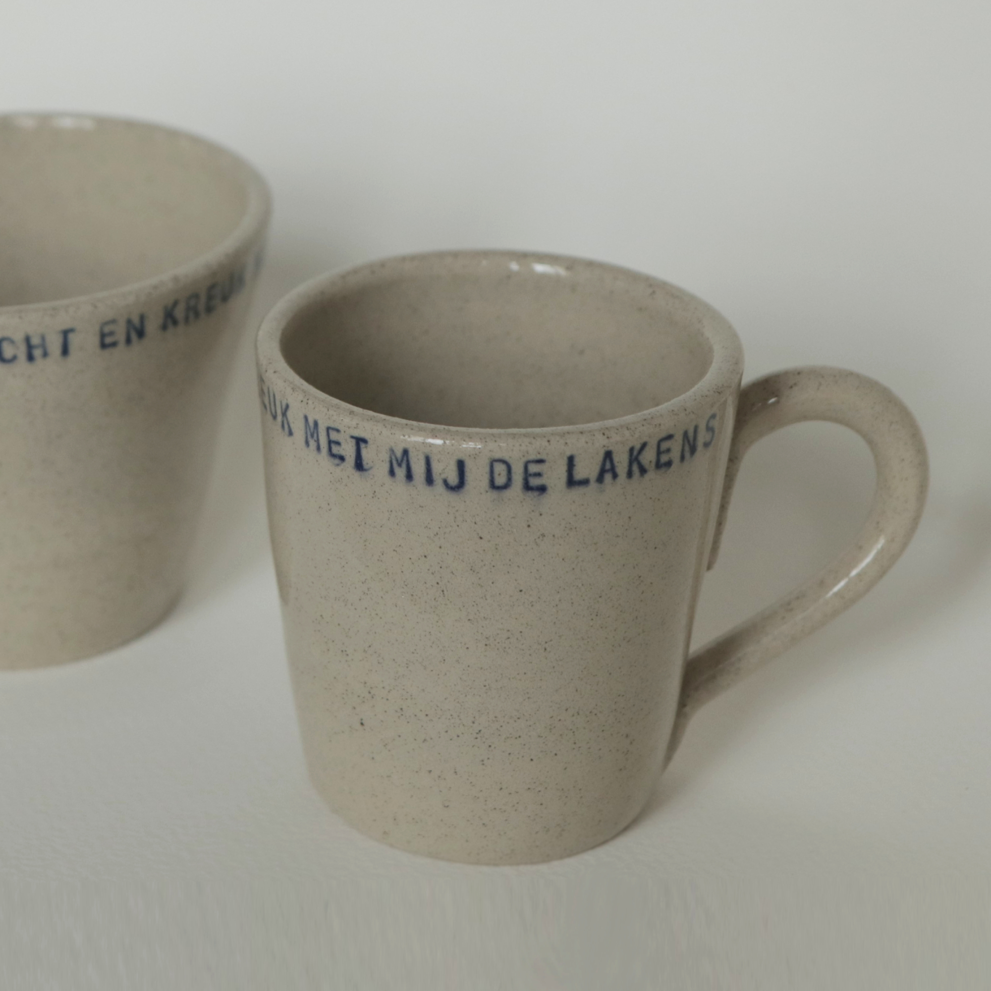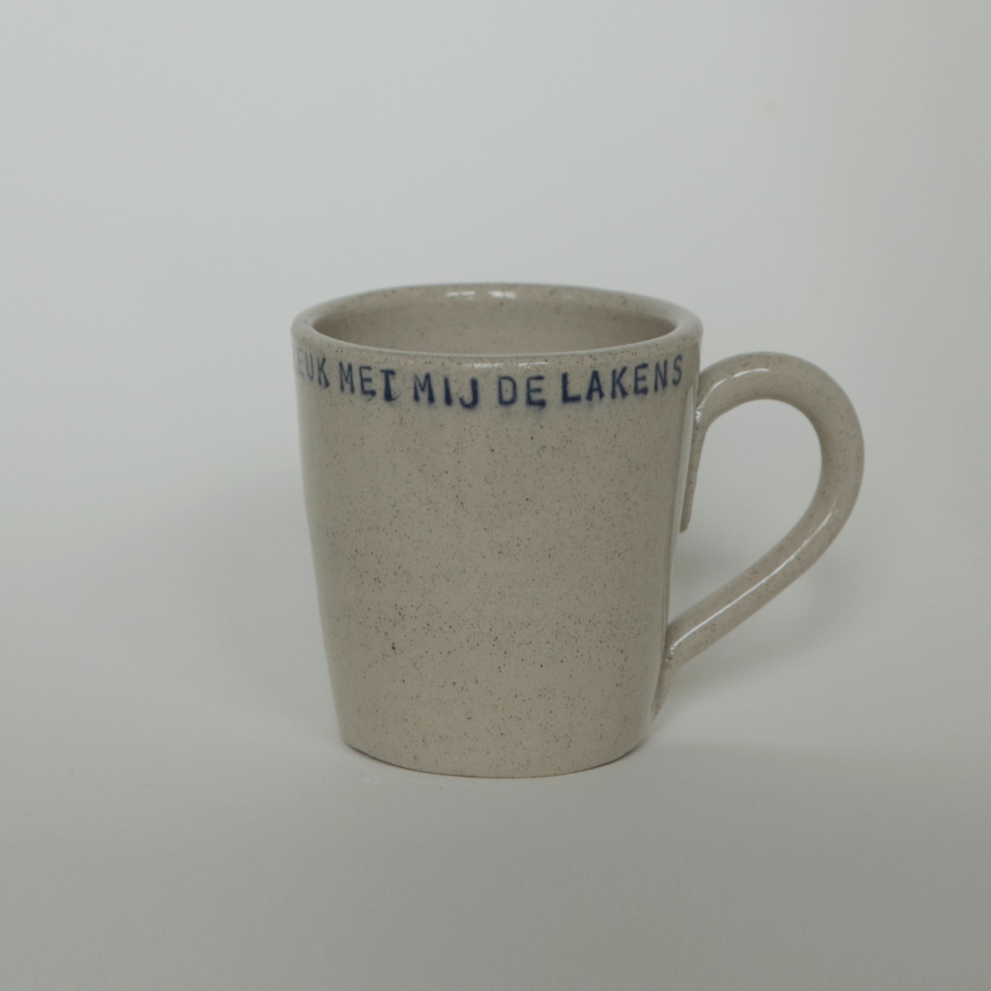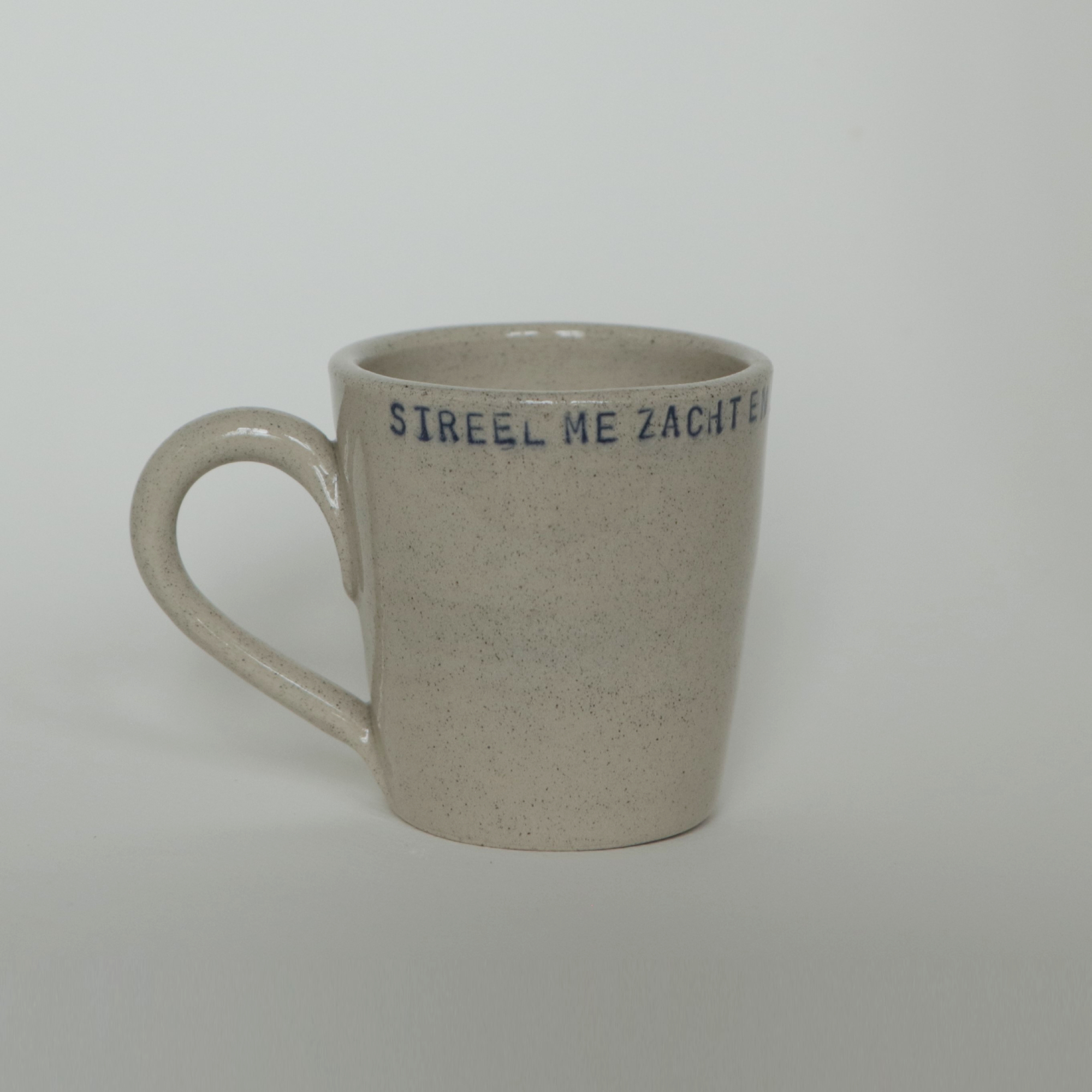 Keramiek kopje met de tekst ‘Streel me zacht en kreuk met mij de lakens’.