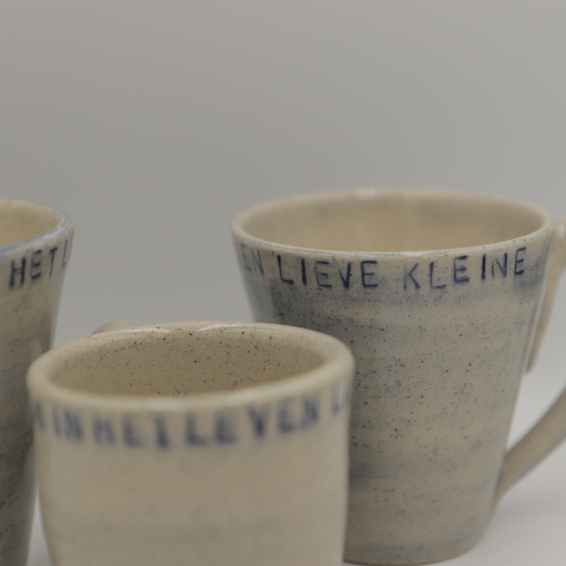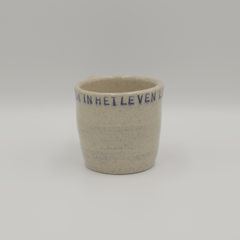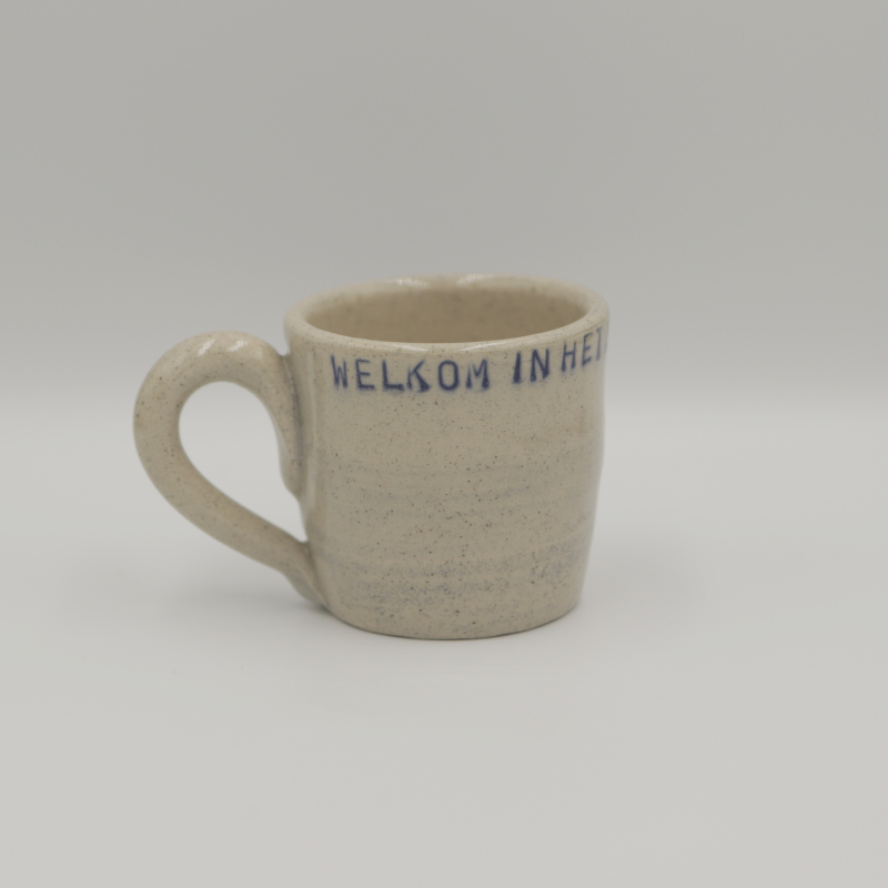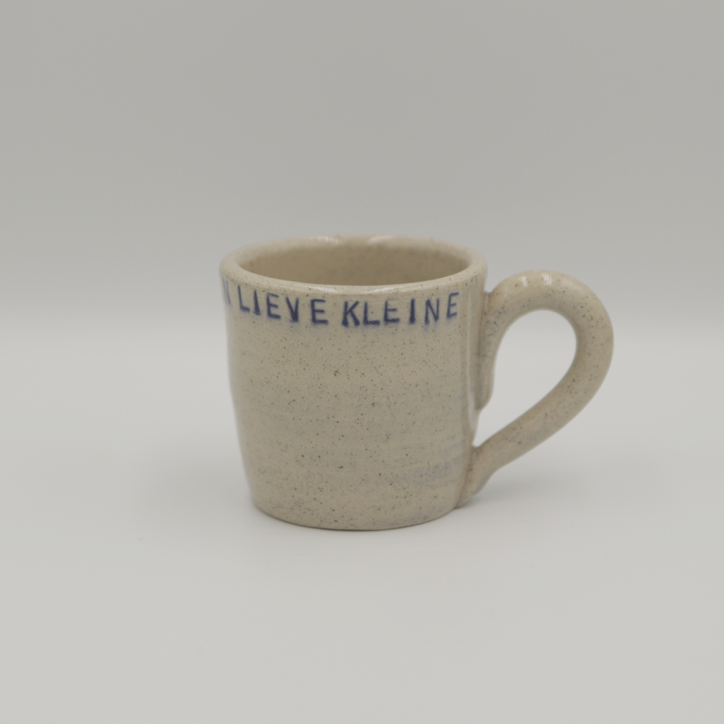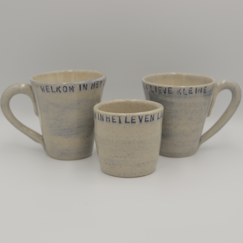 Keramiek kopje met de tekst ‘Welkom in het leven lieve kleine’.